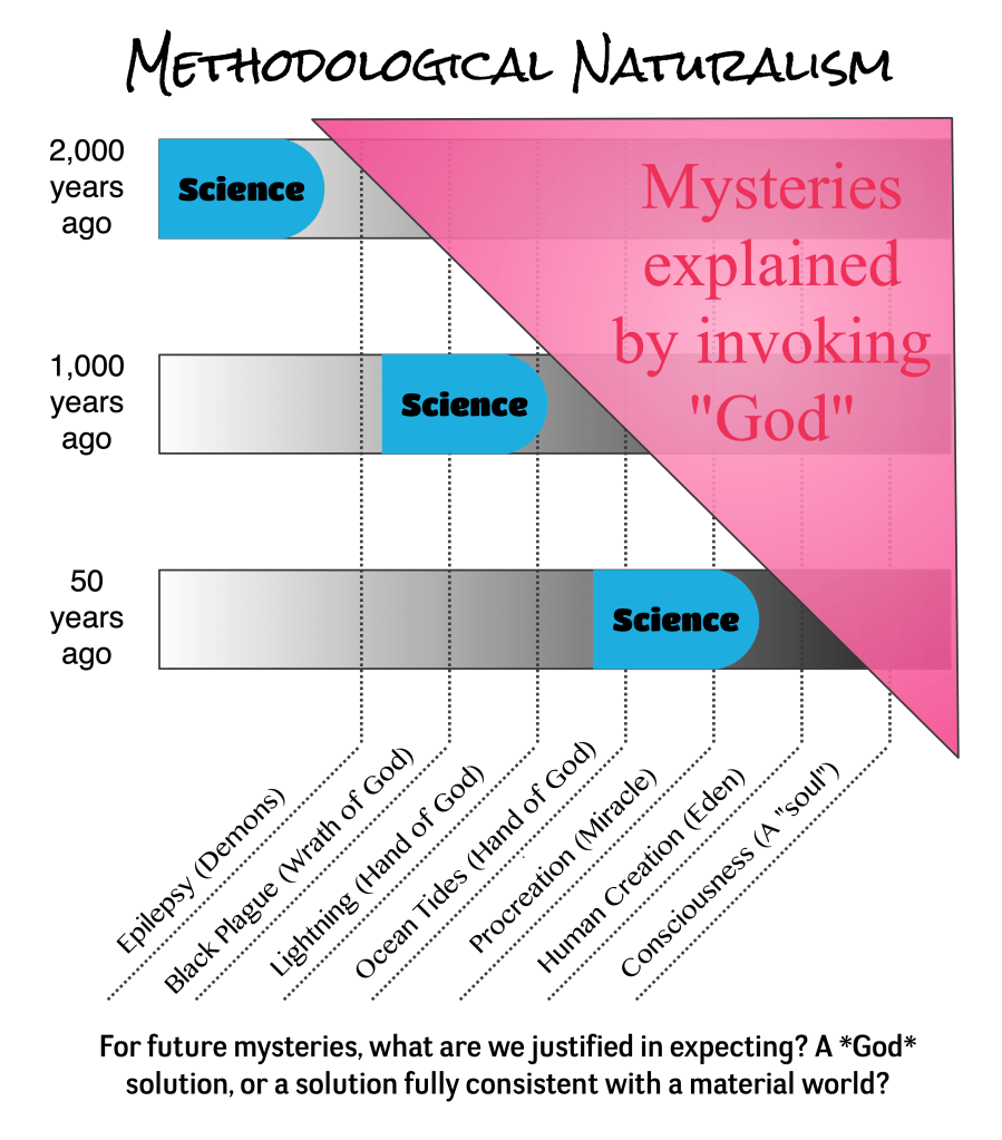 - Question Posed: At the bottom, there’s a thought-provoking question: “For future mysteries, what are we justified in expecting? A ‘God’ solution or a solution fully consistent with a material world?”