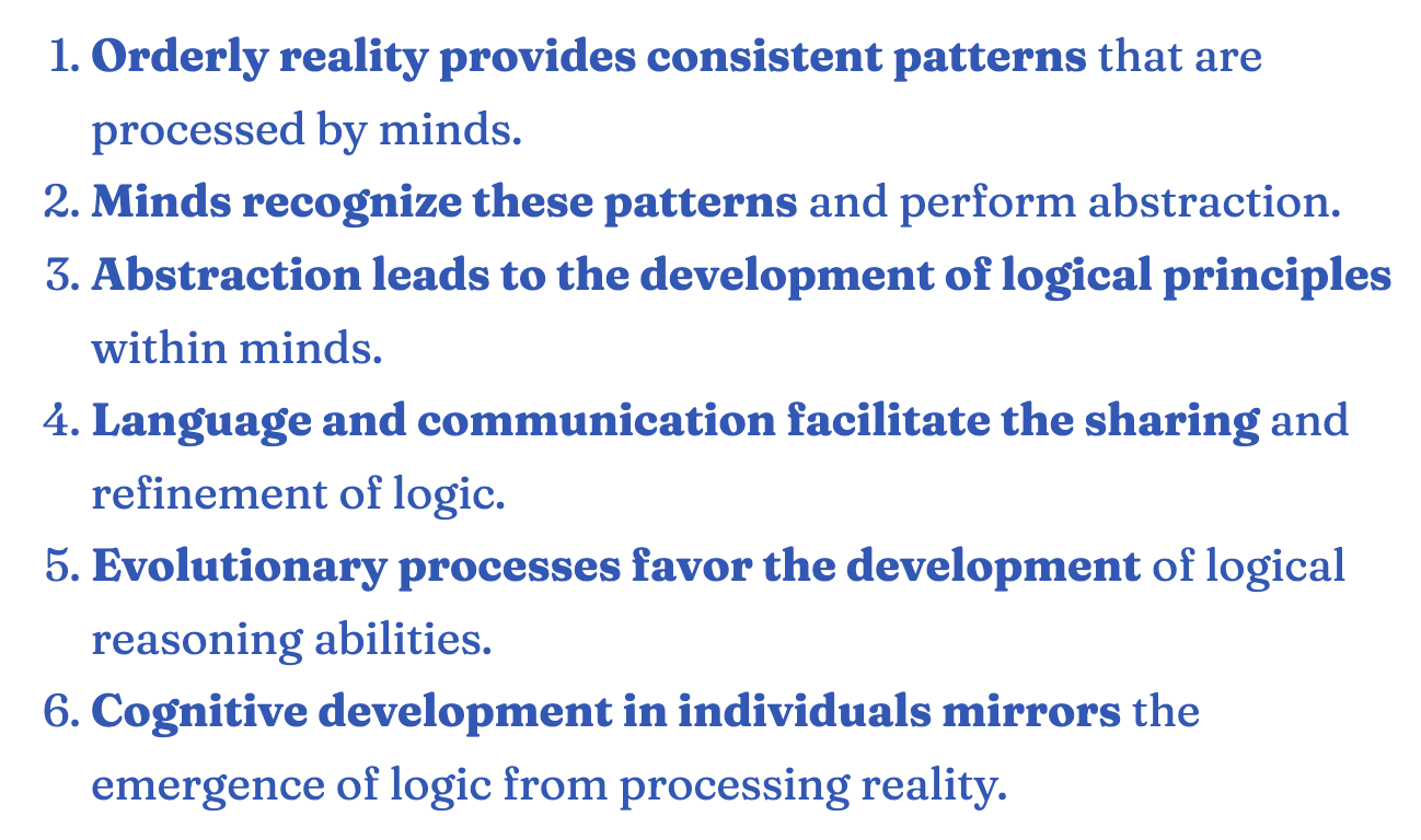 - Formulated the key arguments about how logic emerges from subjective minds processing an orderly reality.