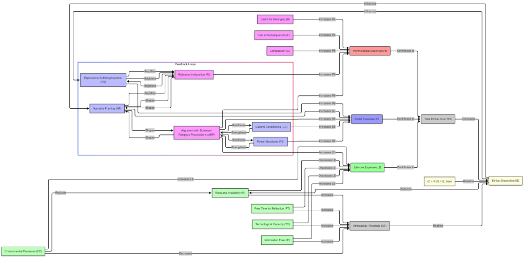 Let’s reframe our model of ethical dynamics in terms of the “affordability” of ethical dispositions, interpreting “affordability” as the psychological, social, and lifestyle “expenses” a society or individual must bear to adopt and sustain a given ethical stance. This perspective shifts the focus from a static ethical disposition score to a dynamic cost-benefit analysis, where ethical choices are constrained or enabled by the resources—mental, communal, and material—available to “pay” for them. Below, I’ll outline a coherent framework, integrating our 13 factors into this new lens, to set the stage for a technical model.