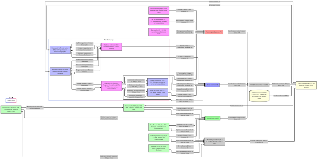 Let’s apply our updated model of ethical dispositions—incorporating the 14 factors (including Alignment with Dominant Religious Proscriptions (ARP))—to a contemporary social scenario where media emphasizes the sentience of octopi, and there’s reasonably priced, lab-produced meat indistinguishable from octopus in taste. This scenario reflects a potential ethical shift toward vegetarianism or reduced octopus consumption, driven by media narratives, technological advances, and consumer choices. I’ll provide: