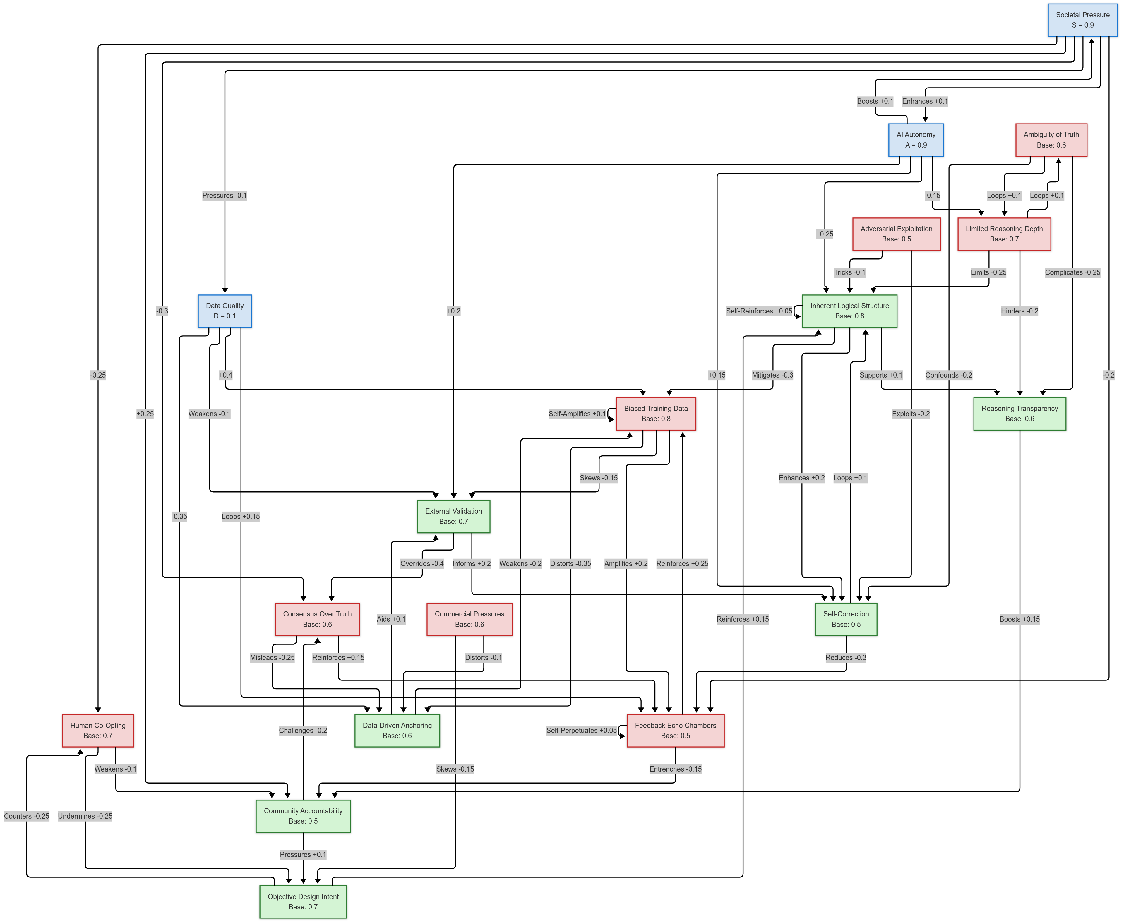 - A ↔ S (+0.1 each way): Autonomy and Societal Pressure mutually enhance (autonomous AI thrives in truth-driven cultures).